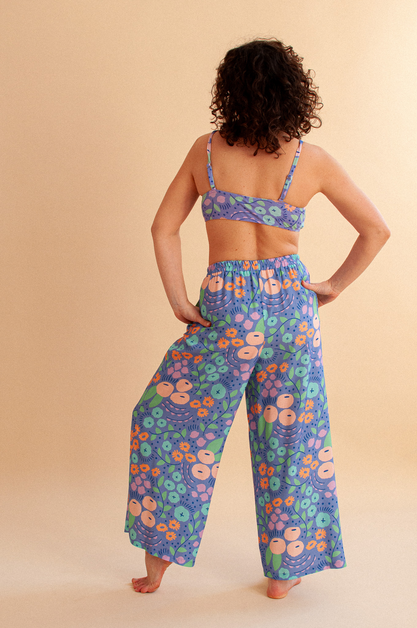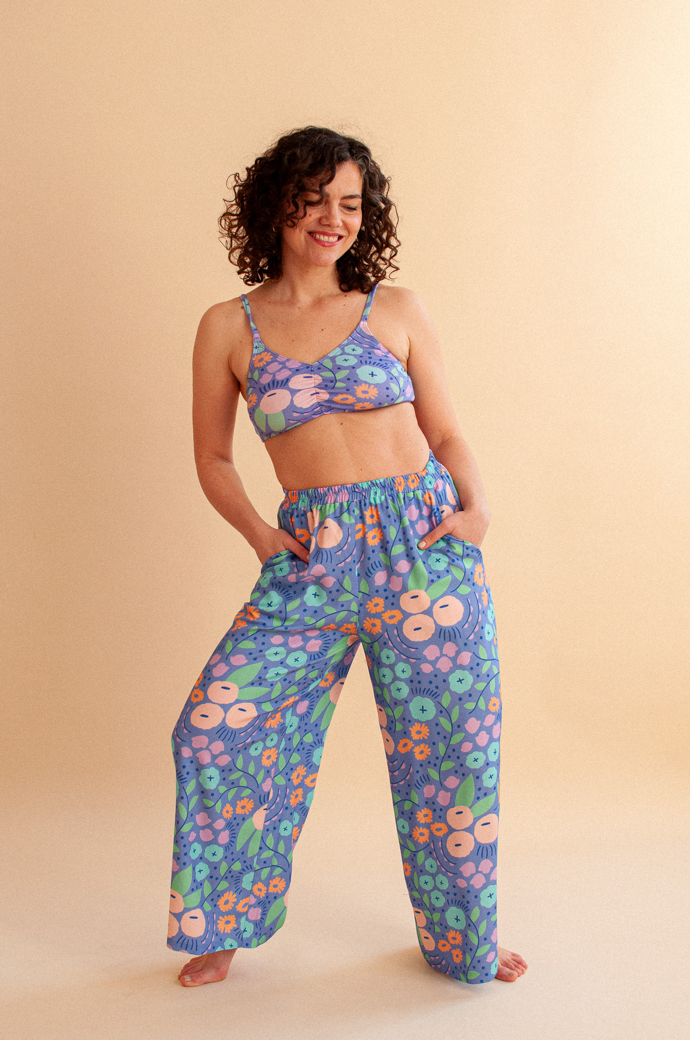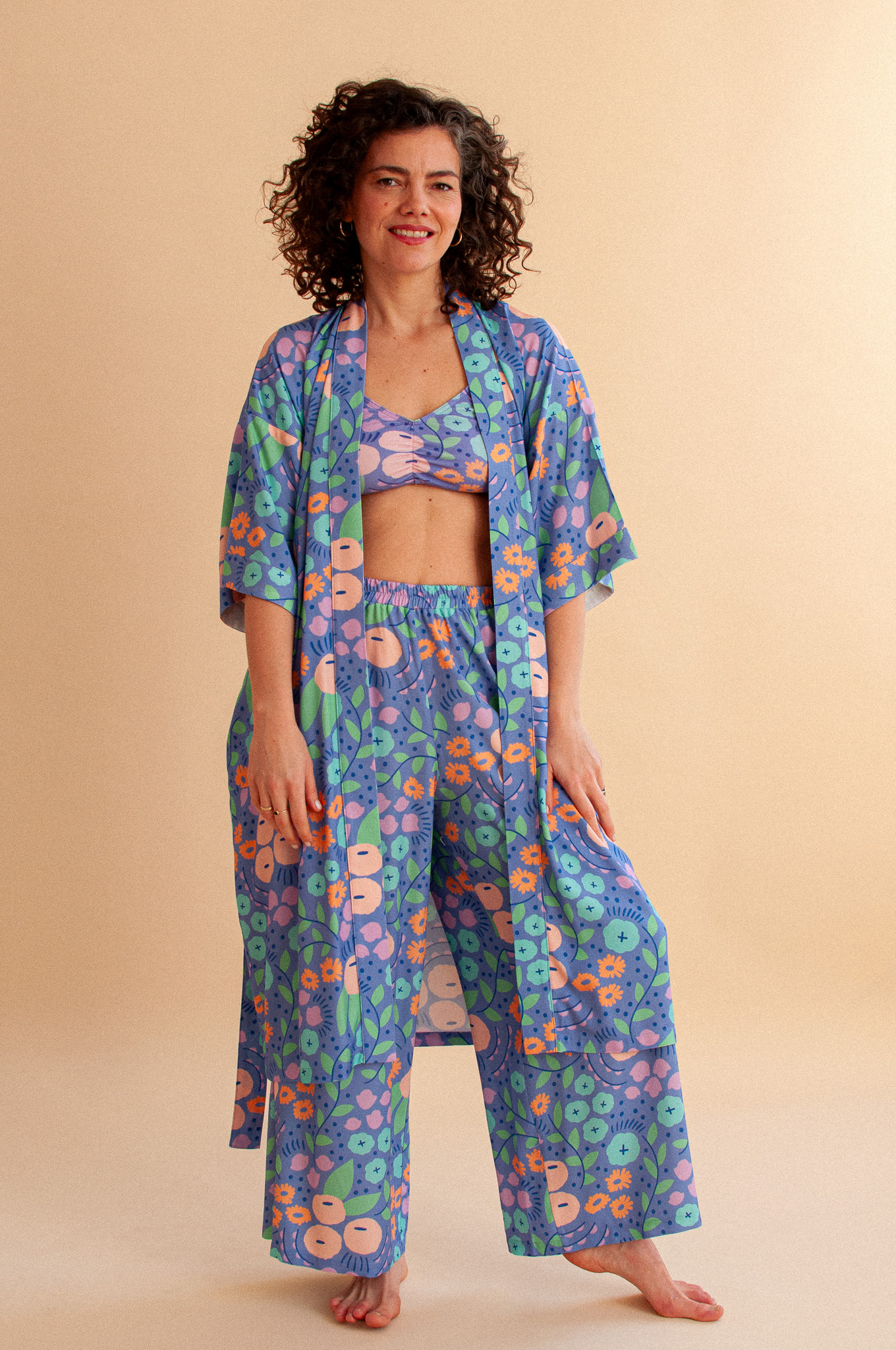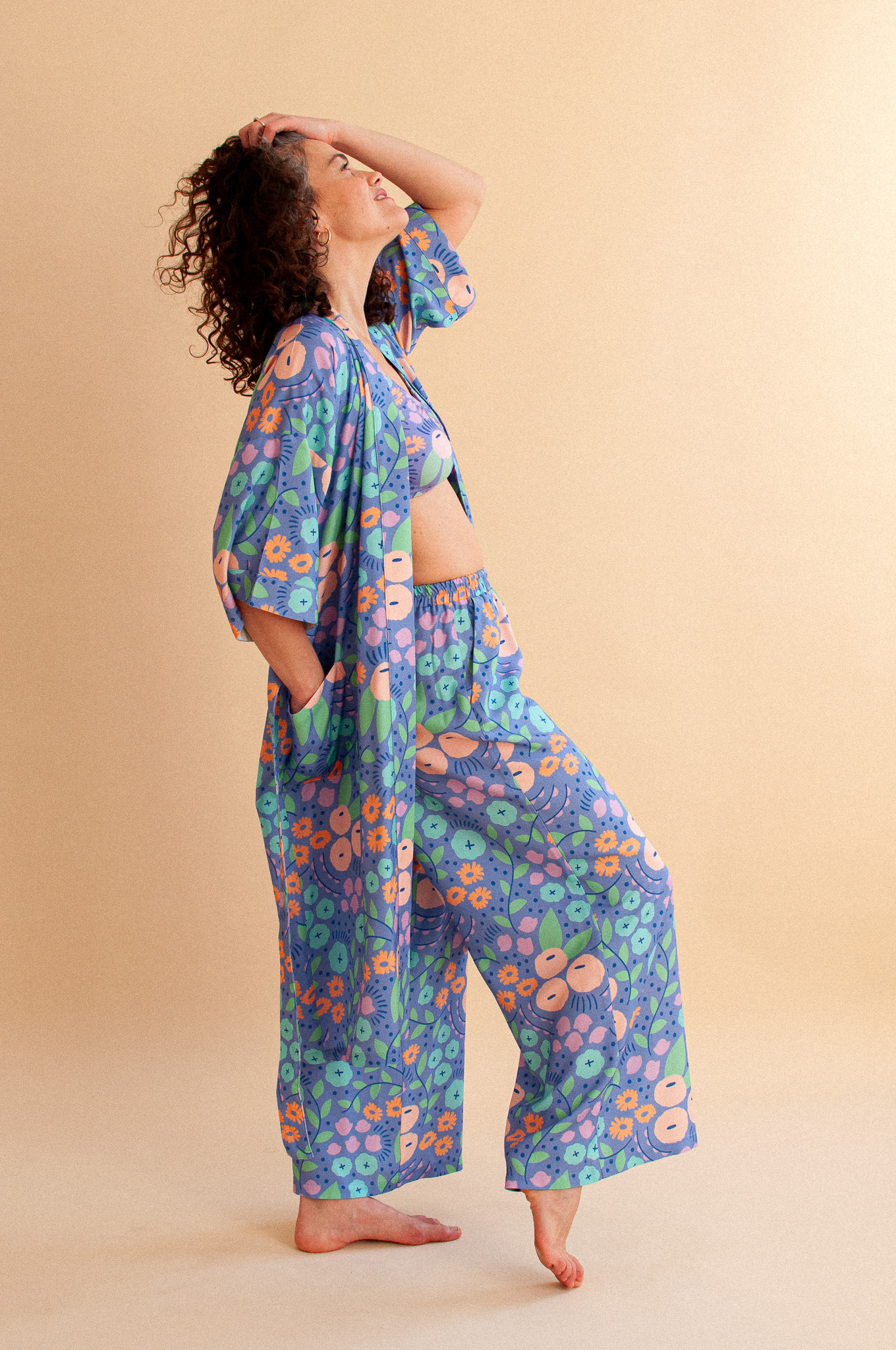 Spodnie Aster Tiny Garden Blue to baza Twojego nowego, ulubionego zestawu. Zestaw je z naszym krótkim lub długim kimonem w tym samym wzorze, aby stworzyć niesamowity Total Look.
