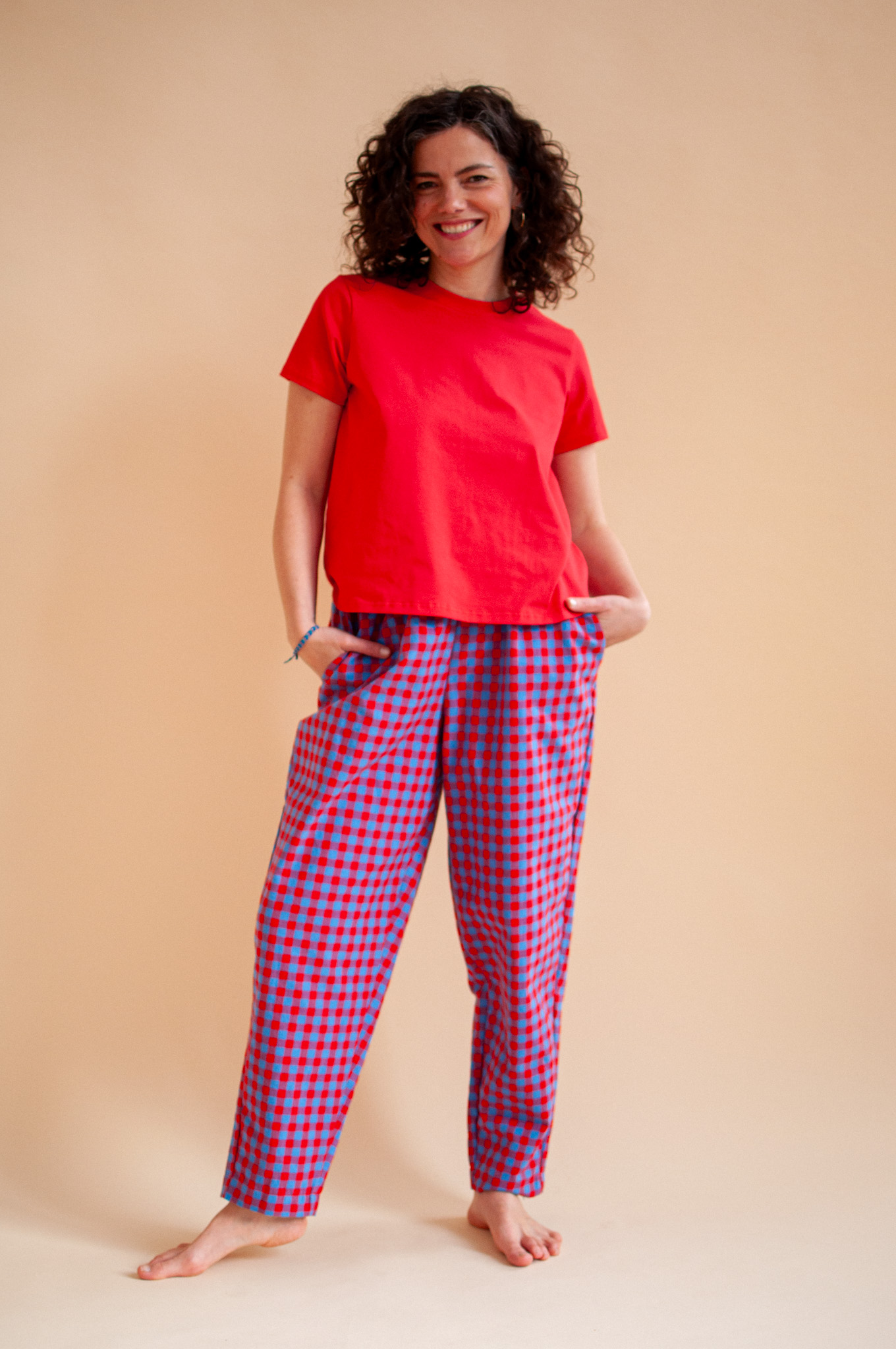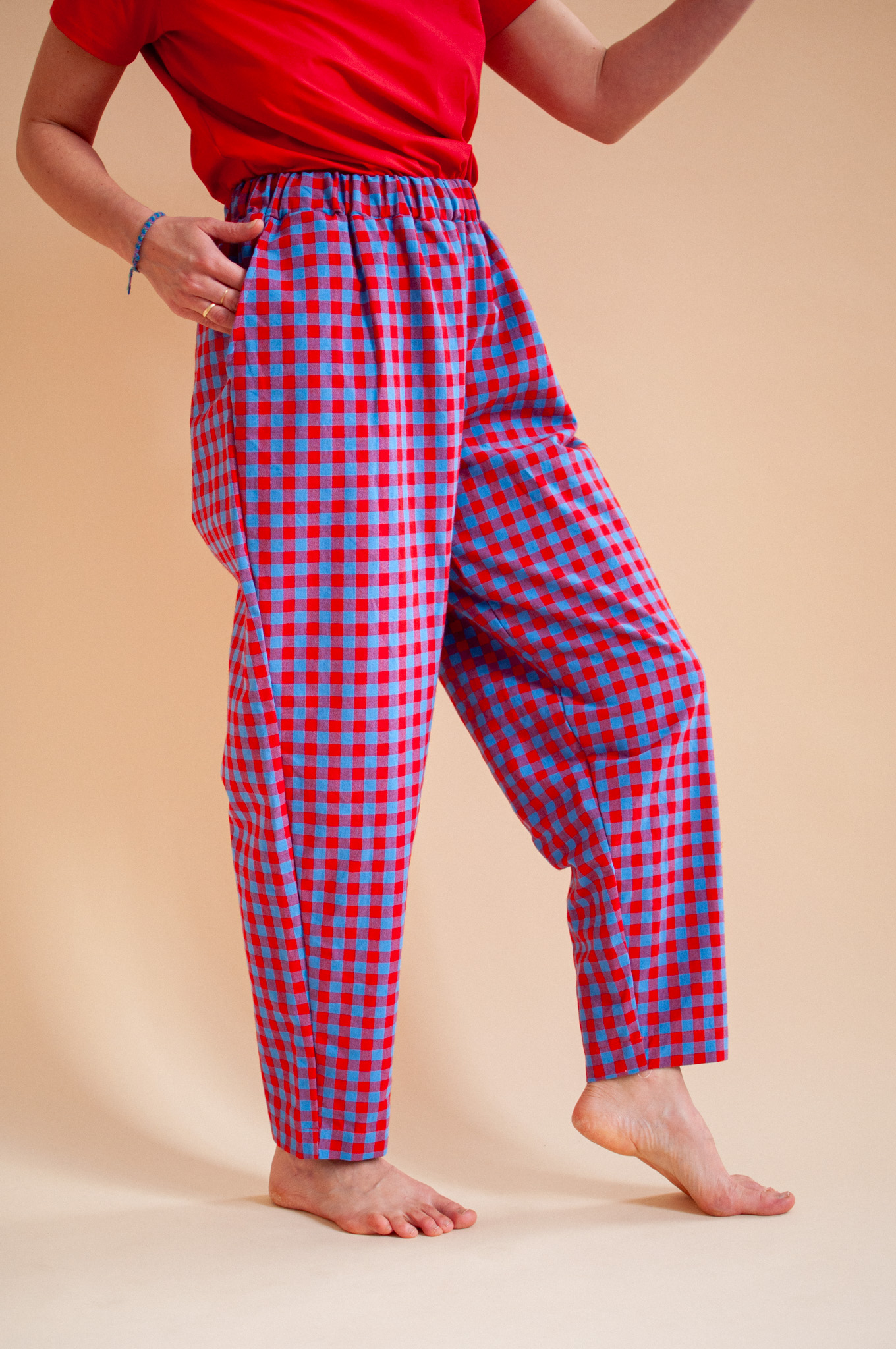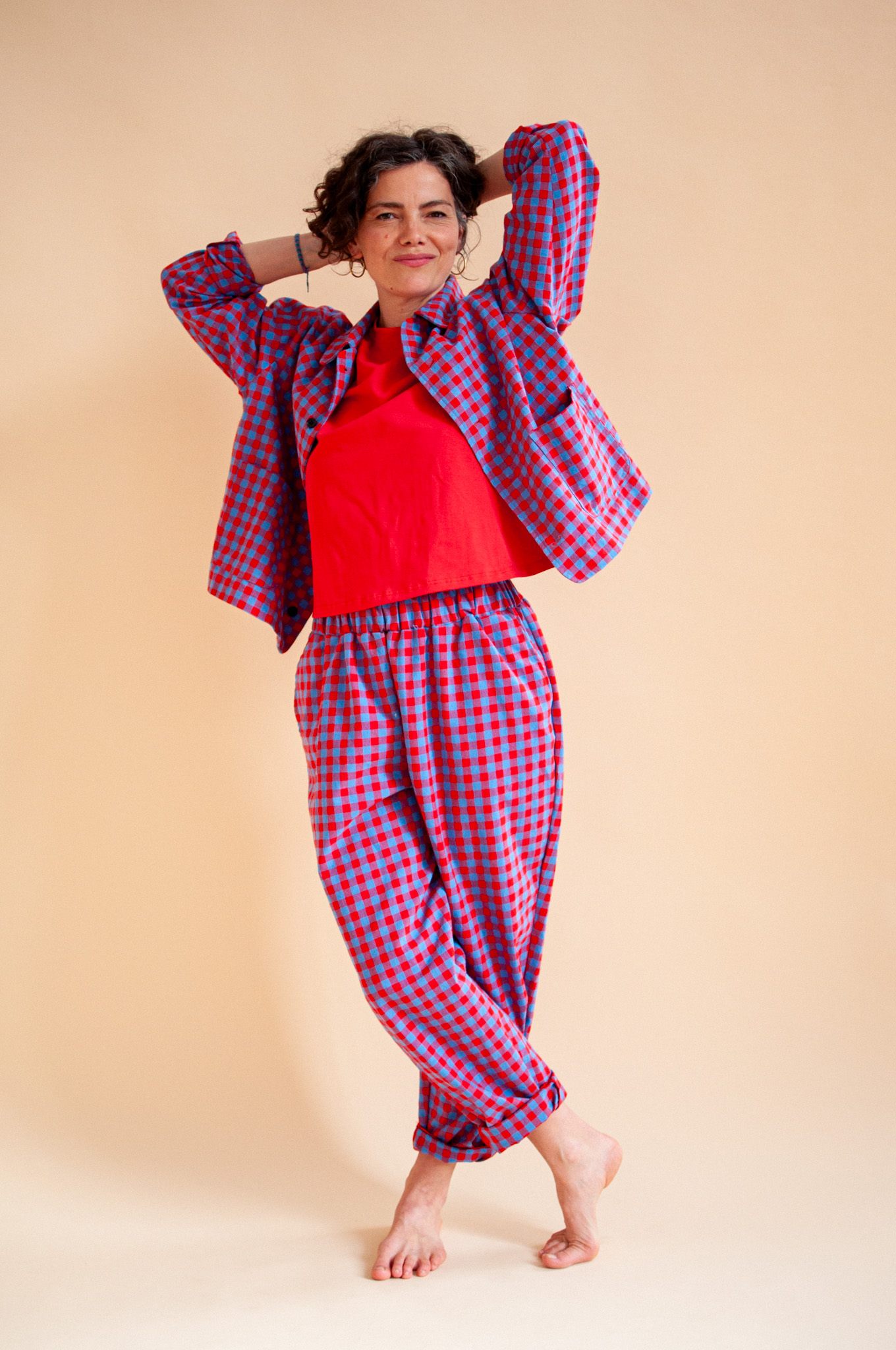 Czy istnieją spodnie idealne? Takie, które wyglądają świetnie, a Ty czujesz się w nich tak swobodnie, jak w ulubionej piżamie? Projektując Estragon, chciałam połączyć te dwa światy. Wybrałam do nich naszą wyjątkową, mięsistą tkaninę bawełnianą w nasyconych odcieniach czerwieni i niebieskiego. To materiał "jak za dawnych lat" – porządny, szlachetny i niemal nie do zdarcia.