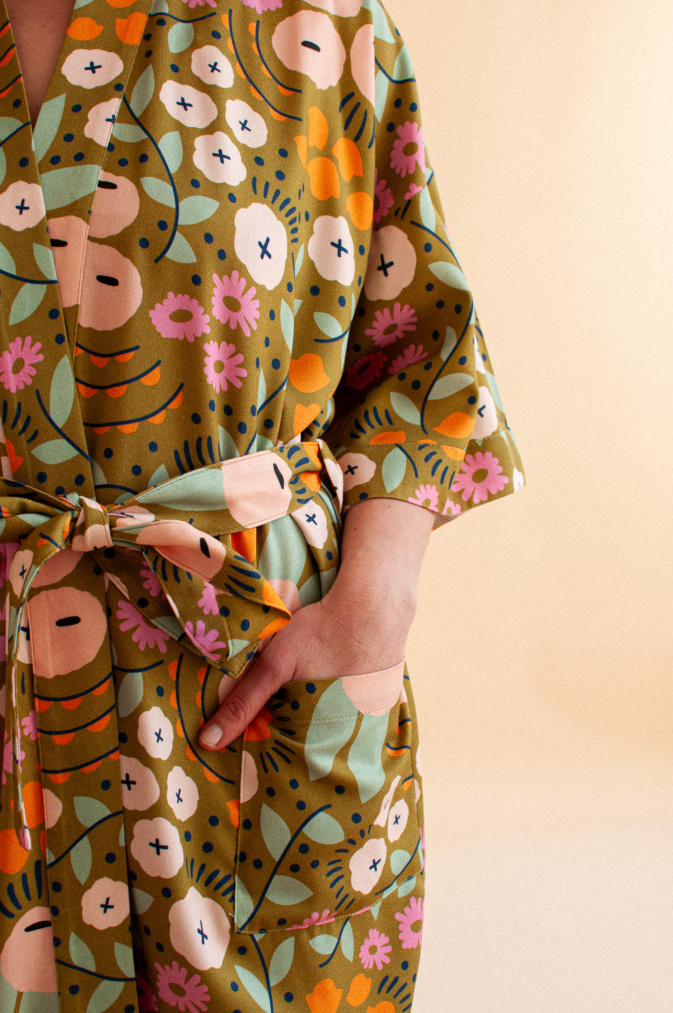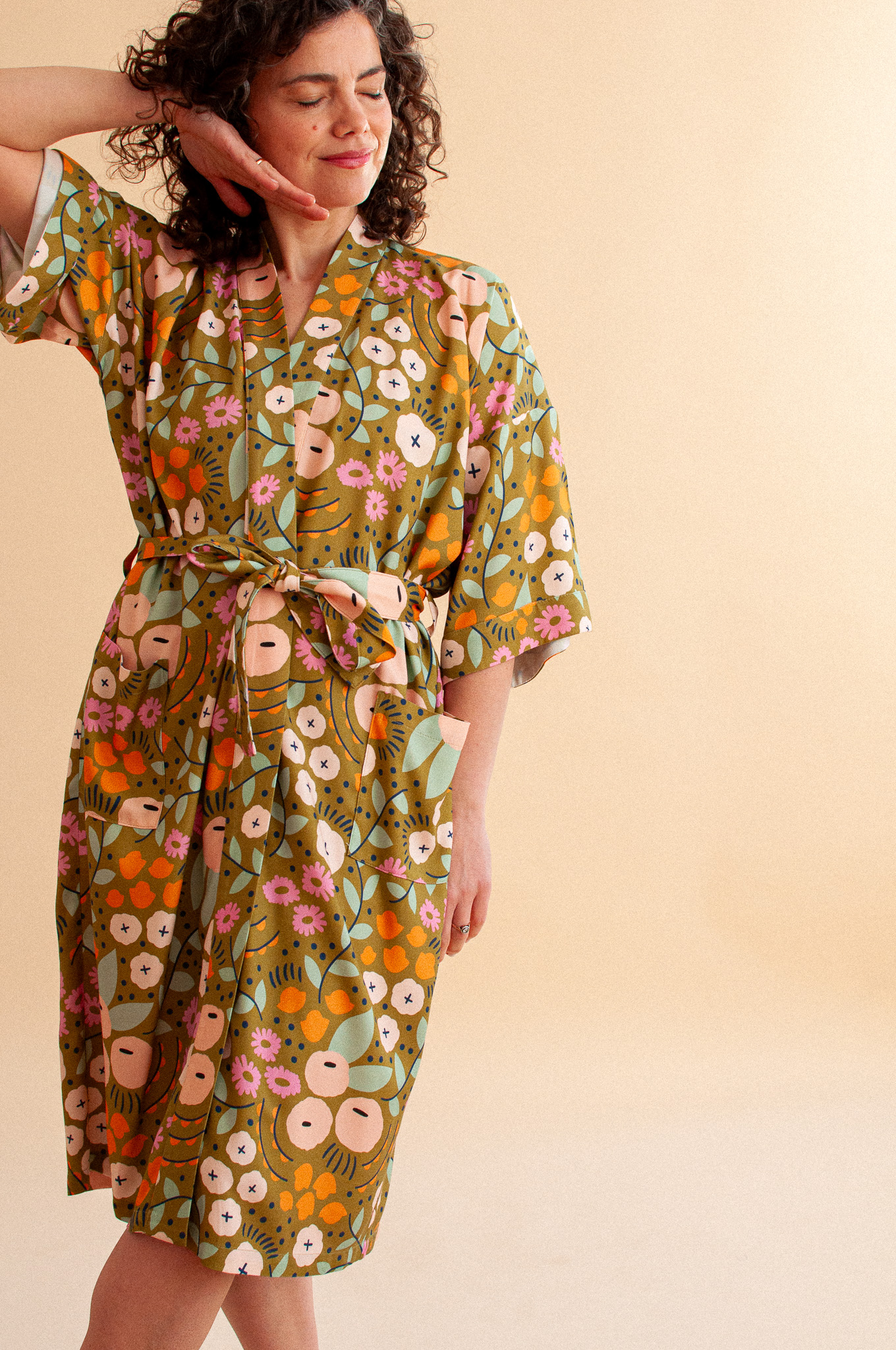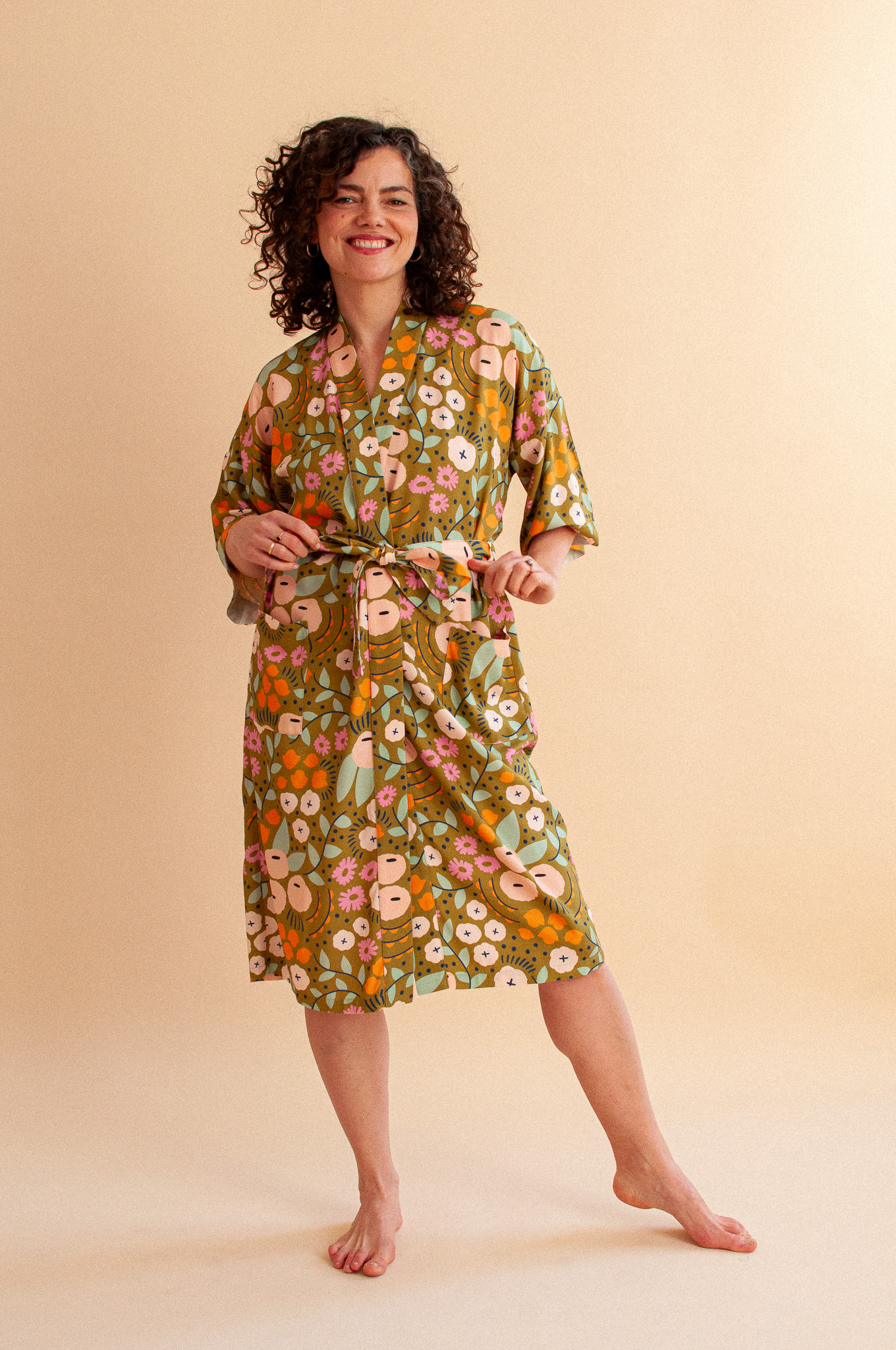 Długie kimono w nastrojowym wzorze Tiny Garden Green (szlachetna oliwka usiana kwiatami) to produkt, który kończy erę wyciągniętych dresów i nudnych szlafroków. Uszyte z 100% tkaniny bambusowej, spływa po ciele z niesamowitą gracją, dając Ci poczucie bycia ubraną, a nie przebraną. To Twój „wewnętrzny dom” – kiedy po całym dniu opiekowania się innymi w końcu je wkładasz, to ono zaczyna opiekować się Tobą.