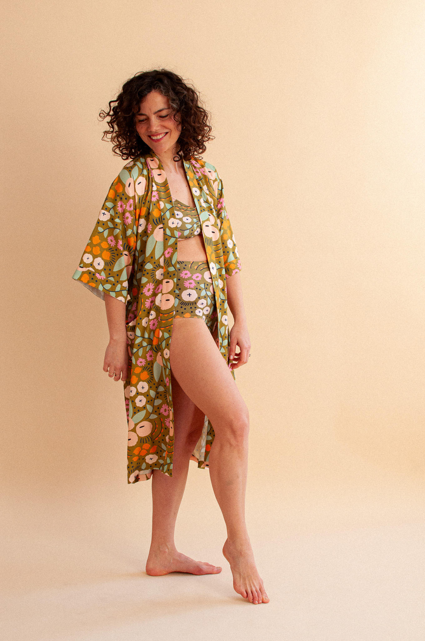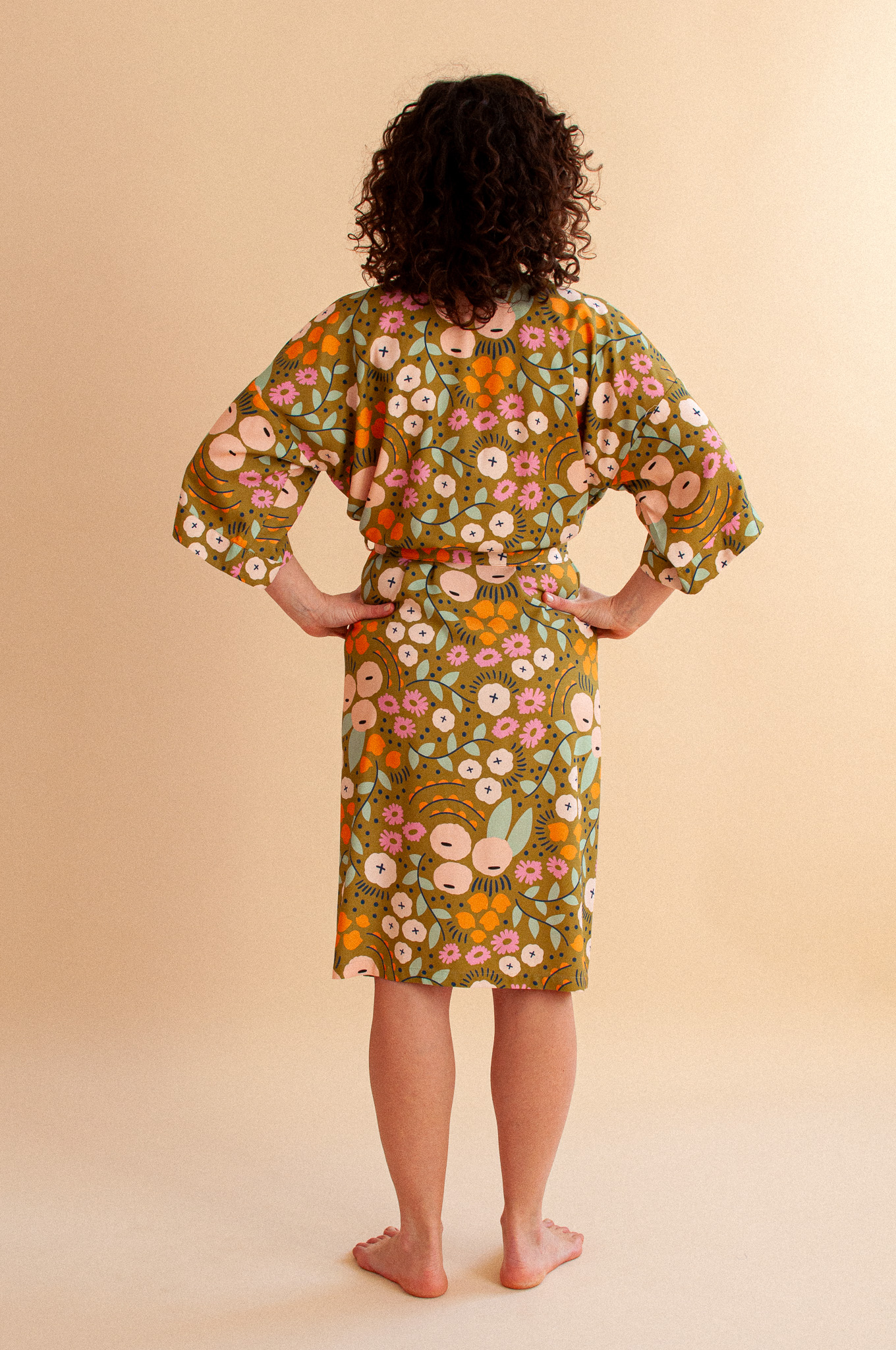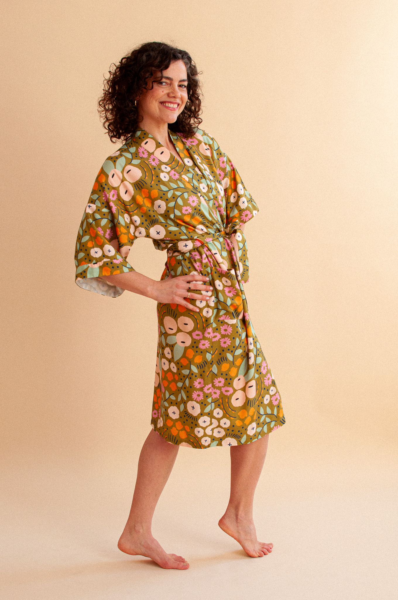 Długie kimono w nastrojowym wzorze Tiny Garden Green (szlachetna oliwka usiana kwiatami) to produkt, który kończy erę wyciągniętych dresów i nudnych szlafroków. Uszyte z 100% tkaniny bambusowej, spływa po ciele z niesamowitą gracją, dając Ci poczucie bycia ubraną, a nie przebraną. To Twój „wewnętrzny dom” – kiedy po całym dniu opiekowania się innymi w końcu je wkładasz, to ono zaczyna opiekować się Tobą.