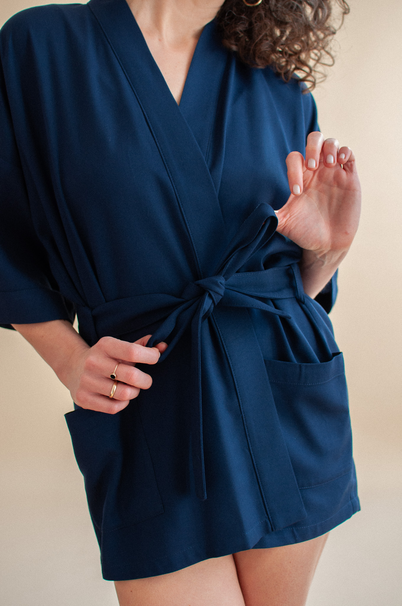 Krótkie kimono w kolorze głębokiego granatu Navy Blue to model, który zmienia zasady domowego i wyjściowego stylu.