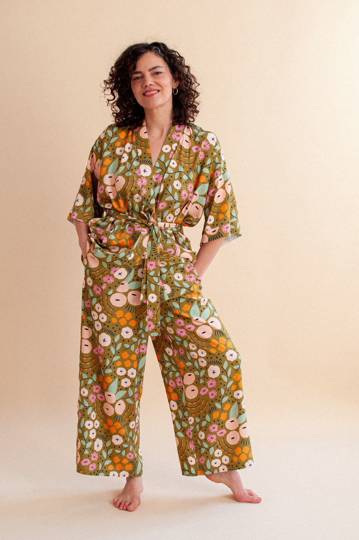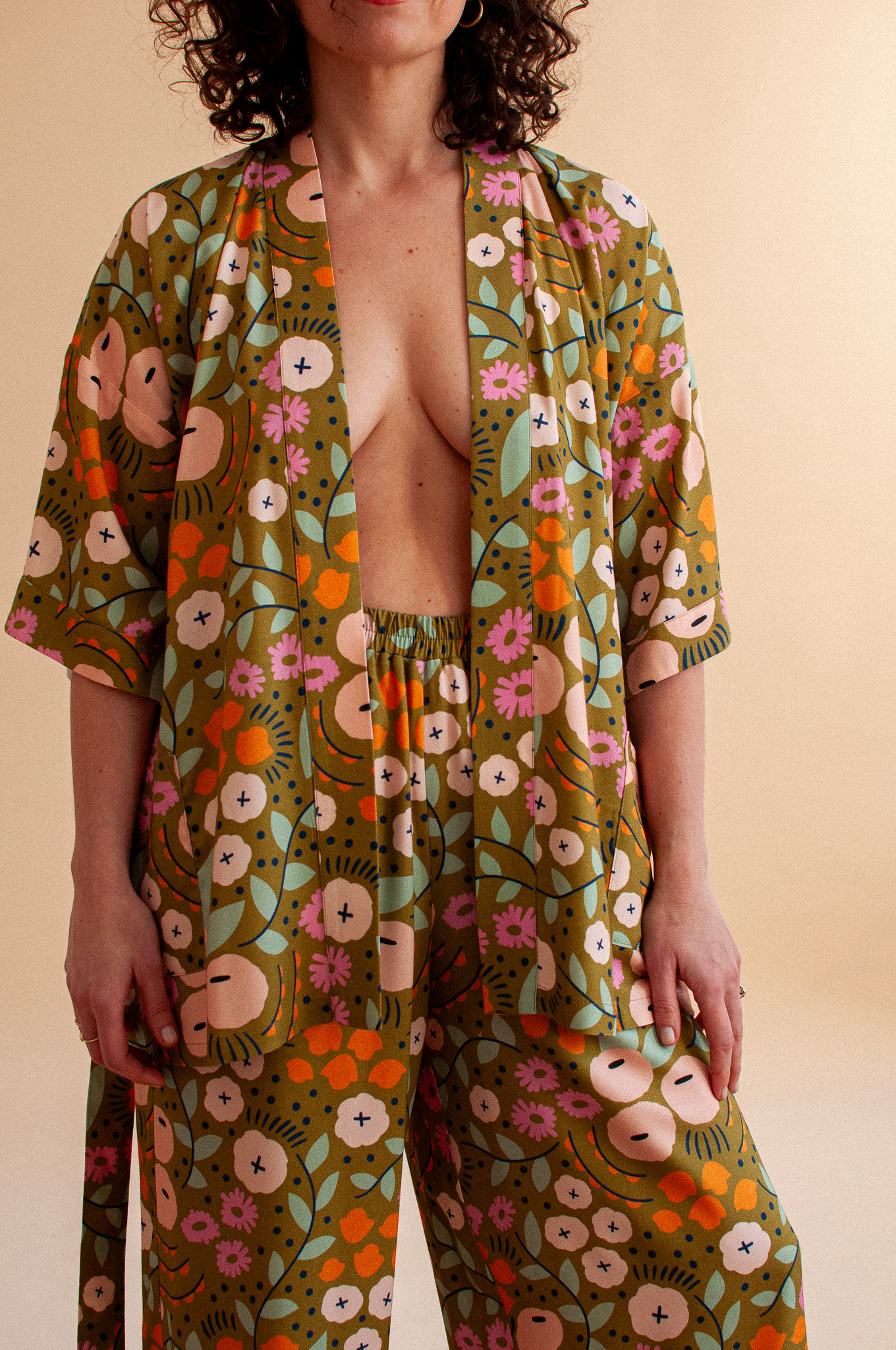 Krótkie kimono w nastrojowym wzorze Tiny Garden Green (nasycona oliwka w kwiatach) to model, który przywraca radość z domowego (i nie tylko!) ubierania się.